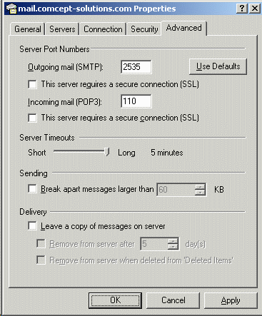 6. The final step is to ensure your timeout settings are correct. Click on the Advanced tab. You will need to make two changes here. First set your "Outgoing mail (SMTP):" port to 2535. Second, set the time out to the maximum, which in Outlook Express 6 is 5 minutes.