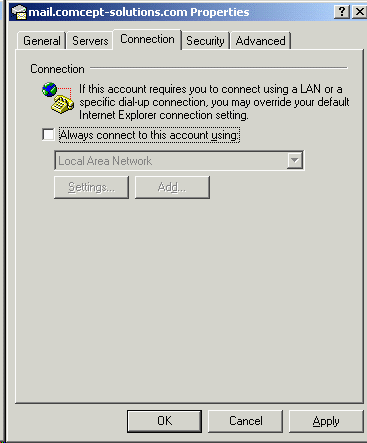 At this point click Apply then Ok. You are finished and ready to use your new/updated e-mail account. If you have any questions or need further support please contact ComCept Support via your normal channels.