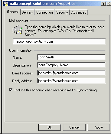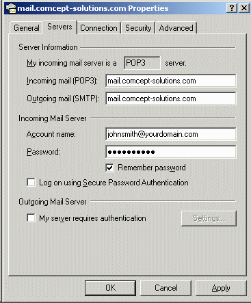 For the Account name field you must use your full e-mail address (if you do not use your full e-mail address for your Account name your e-mail will not work). Do not make any other changes unless advised to by a ComCept support representative. Click Apply when finished.