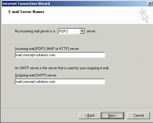 3. In this next step both Incoming and Outgoing mail servers will match exactly. Once you have entered the e-mail server information click Next: