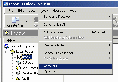 1. Start Outlook Express. Once running, click the menu item Tools, then Accounts.
